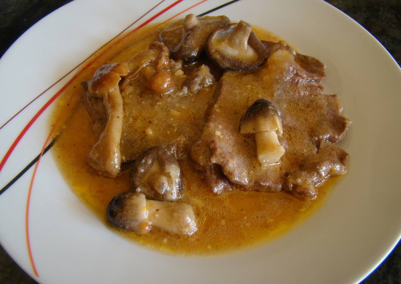 Es bistec de ternera cortado bien fino, acompañado de unas setas, un platos sencillo y delicioso.