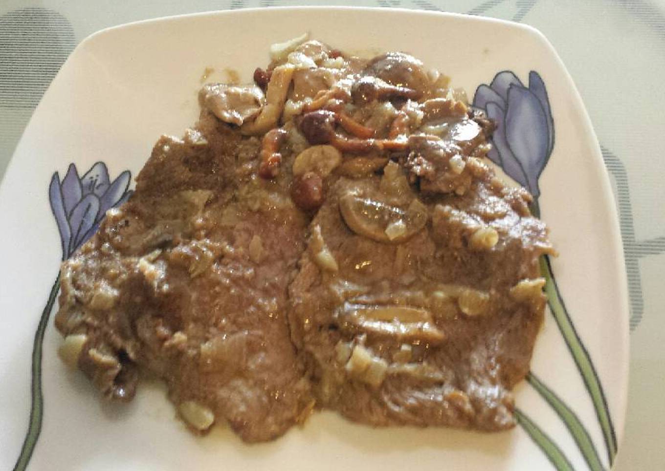 - Se ponen los filetes con la cebollas y setas un chorrito de vino blanco unos 5 minutos para que mezclen los sabores y listo