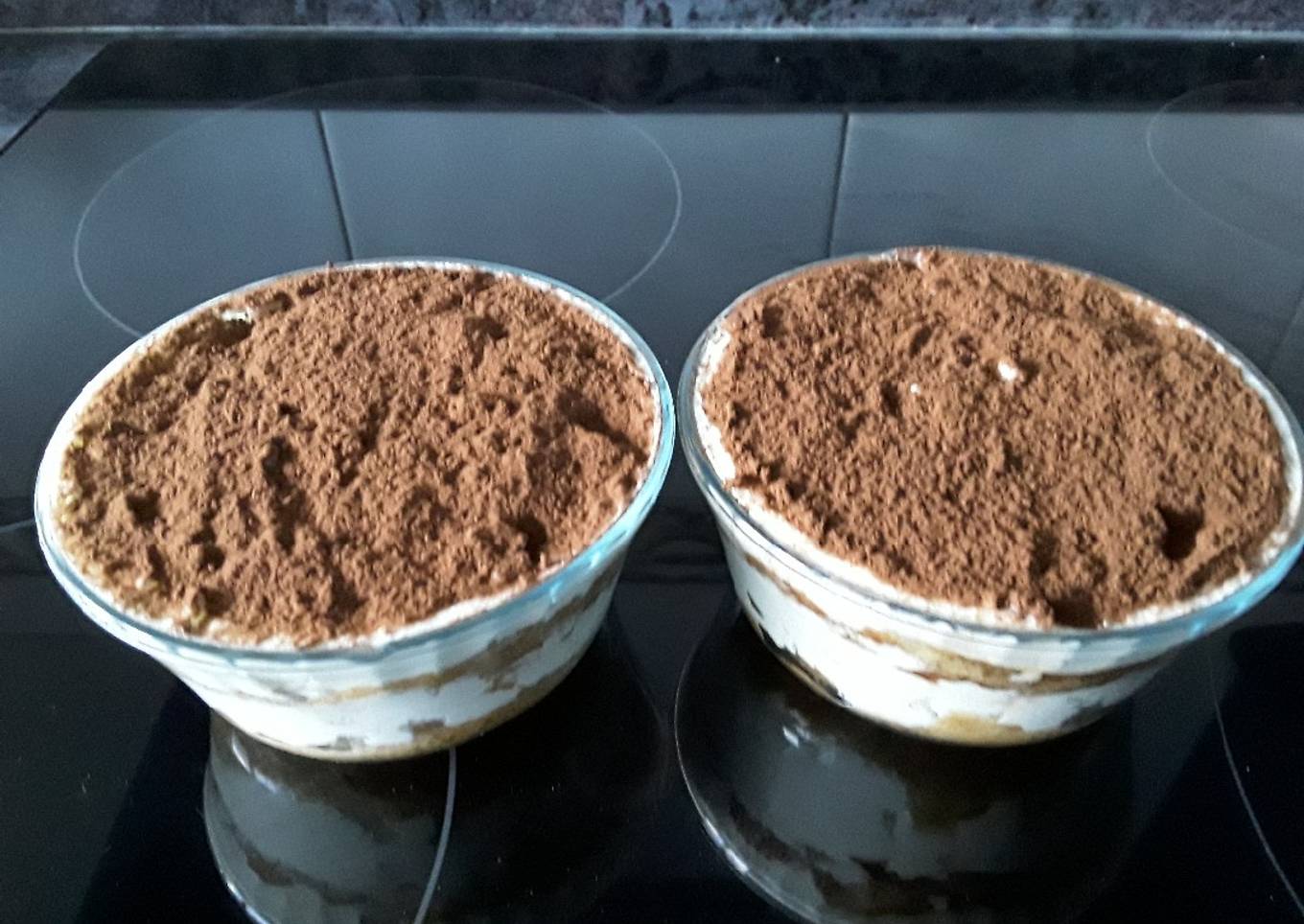 - Vamos mojando los bizcochos en el café frío, para forrar el fondo del recipiente, ponemos una capa de crema, con la ayuda de un colador una capa de cacao, bizcocho, crema para terminar con cacao. Dejamos reposar en la nevera unas horas antes de servir.