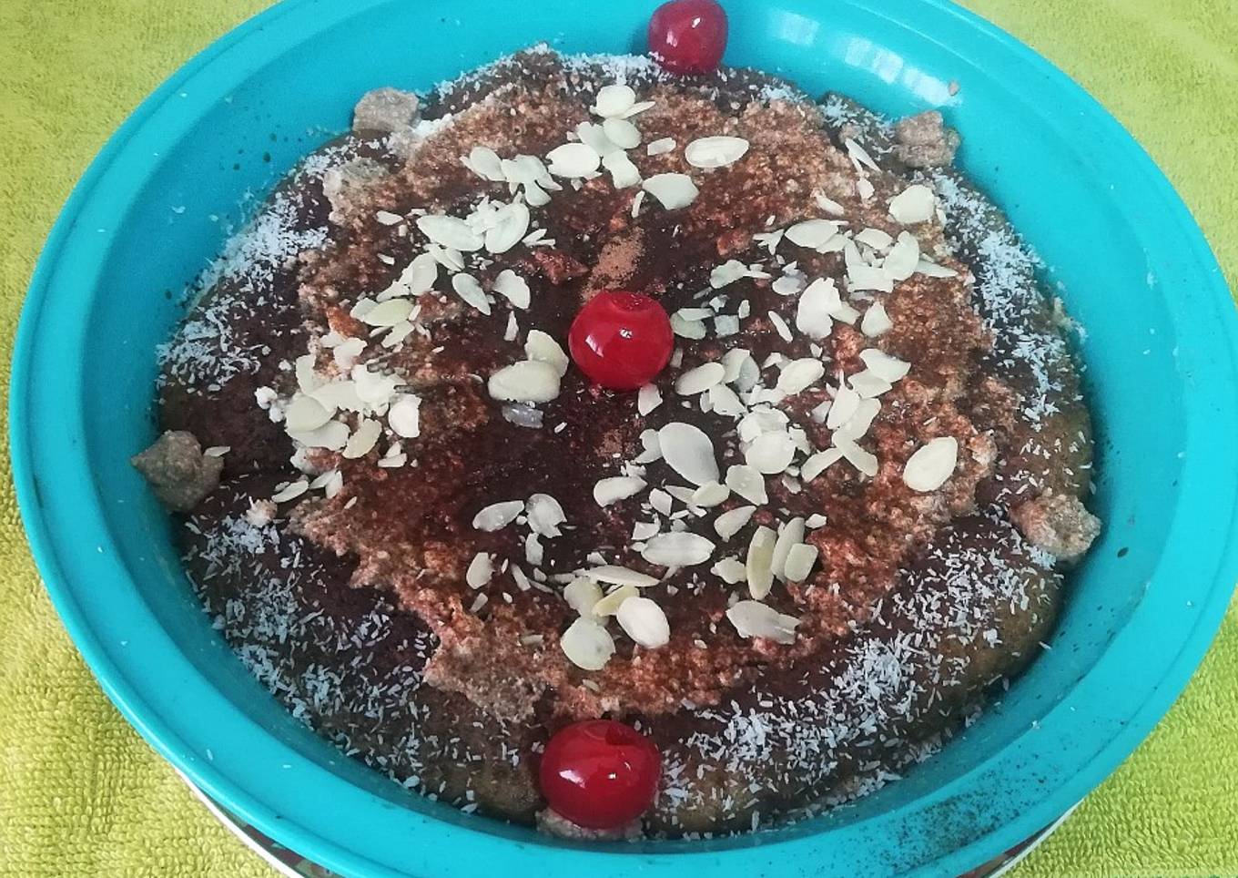 - Repartimos la crema por encima de la última capa de bizcochos, espolvoreamos 2 cucharadas de cacao con ayuda de un colador y decoramos al gusto con almendras laminadas, coco rallado, guindas. Etc