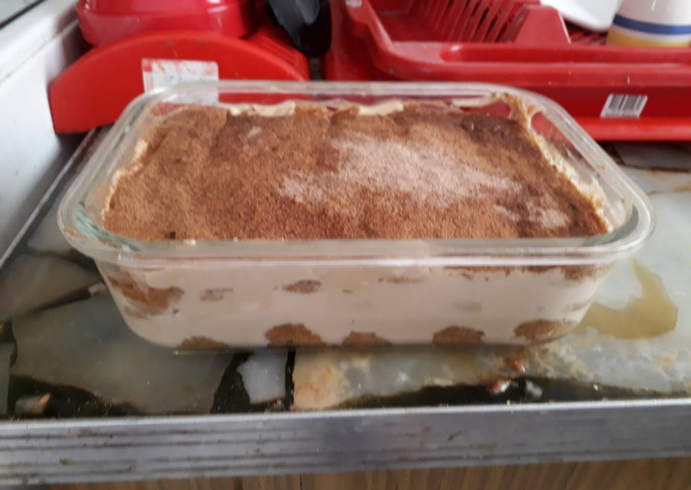 - Por último, pon lo que te resta de la mezcla de Crema y casacrem (debe ser un poquito más gruesita esta capa que las anteriores), esparcela y espolvorea canela en polvo con un colador arriba.