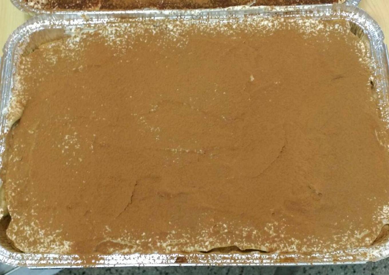 - Poner en la bandeja los bizcochos y bañar con el café, poner una capa de crema y espolvorear con cacao. Volver a repetir el proceso creando otra capa