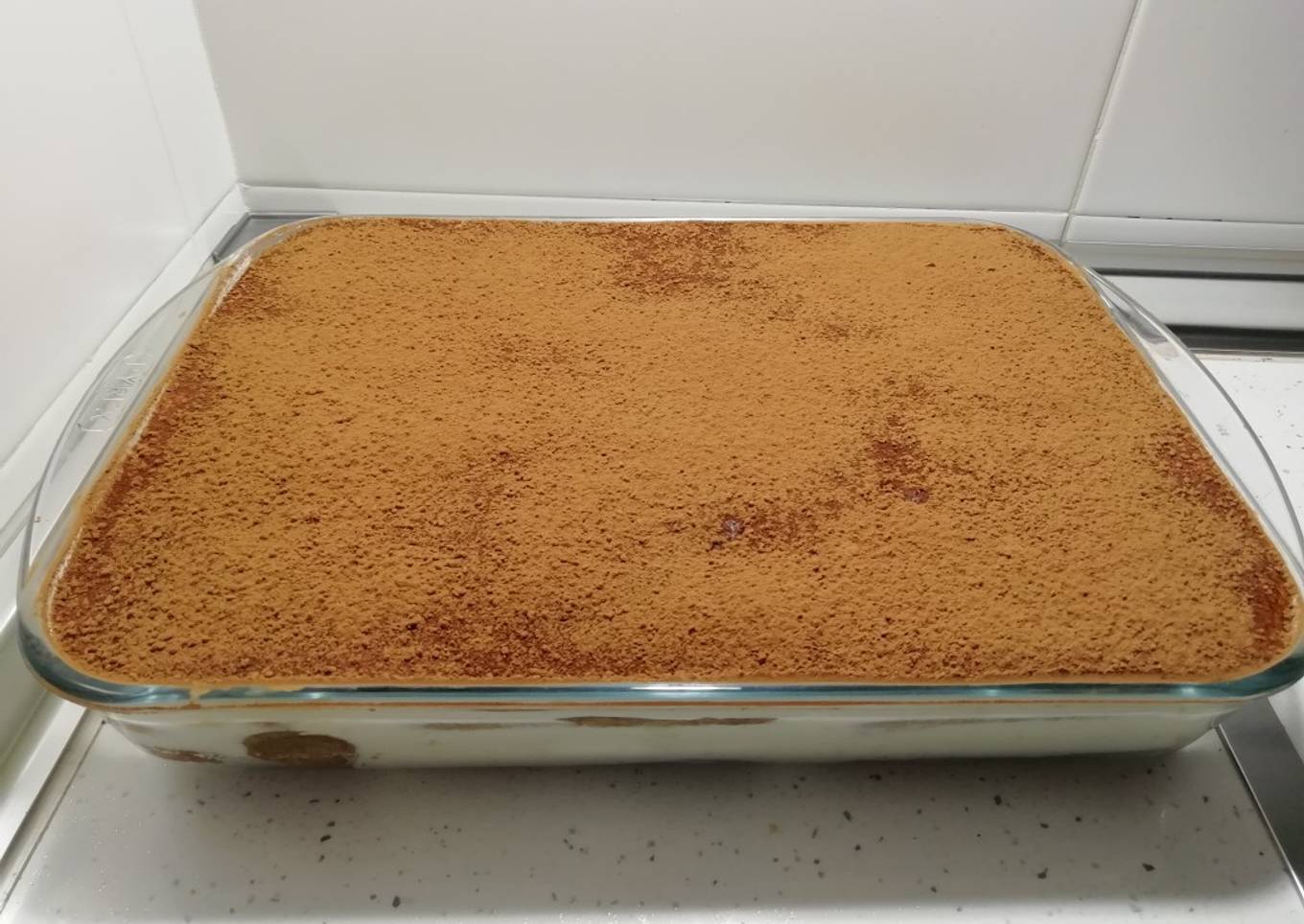 - Por último, vamos encando el cacao puro en polvo por encima con un colador hasta cubrir toda la superficie. Metemos. La nevera que se ponga bien fresquito y empape bien todos los sabores. De un día para otro mejor que mejor! Y a disfrutar el rico postrecito!