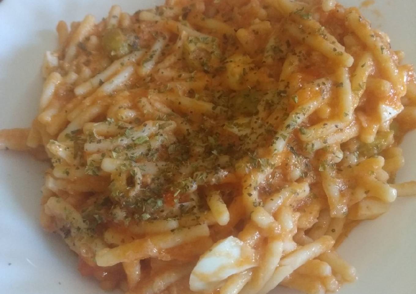 - Picar las aceitunas. Sofreír en una sartén la cebolla y ajo, escurrir en un colador. Poner en un bol los fideos, cebolla, ajo, atún, aceitunas, huevos y salsa de tomate, mezclar. Presentar en un plato llano la fideuá, espolvorear con orégano. Servir.
