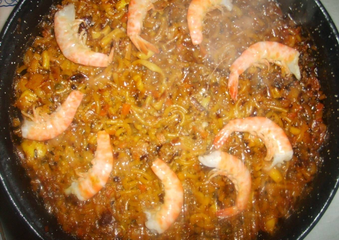 - Rehogar en el 2 los fideos, añadirle el caldo de pescado, chipiron, rectificar de sal y dejar cocer 10´- 12´´ (segun diga fabricante fideos). Cuando la fideua este practicamente hecha añadir las gambas.Dejar reposar unos minutos.