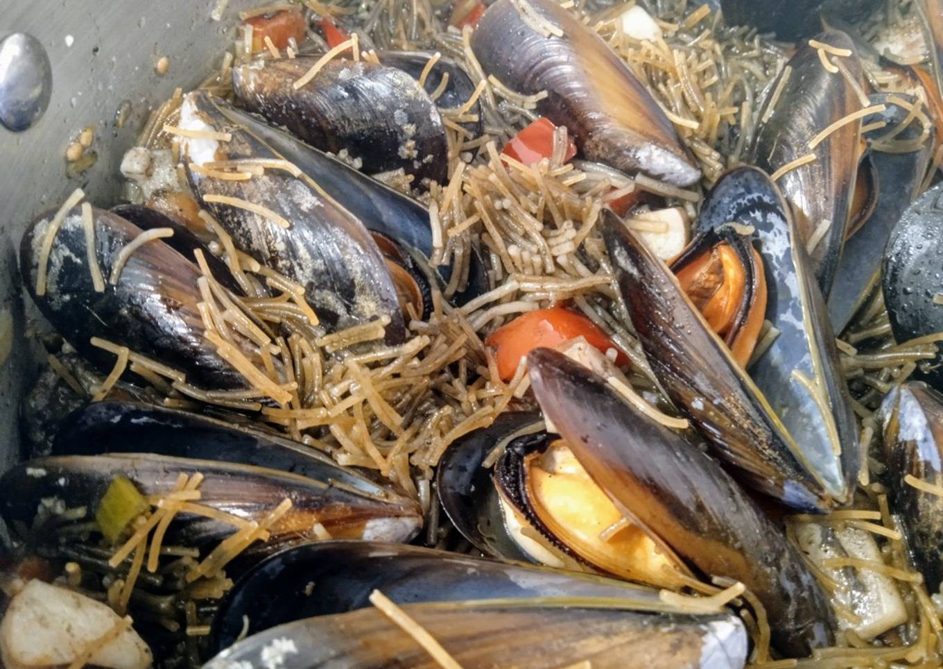 - Añadir los mejillones por encima del líquido distribuidos por la olla. Estos soltaran algo de líquido al abrirse probablemente que nos vendrá muy bien