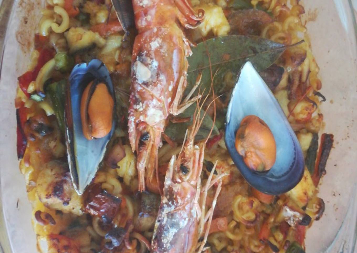- Preparamos la fideuá en una fuente para horno, añadimos el sofrito, mezclar bien y a 200 grados con ventilador 20' más o menos.