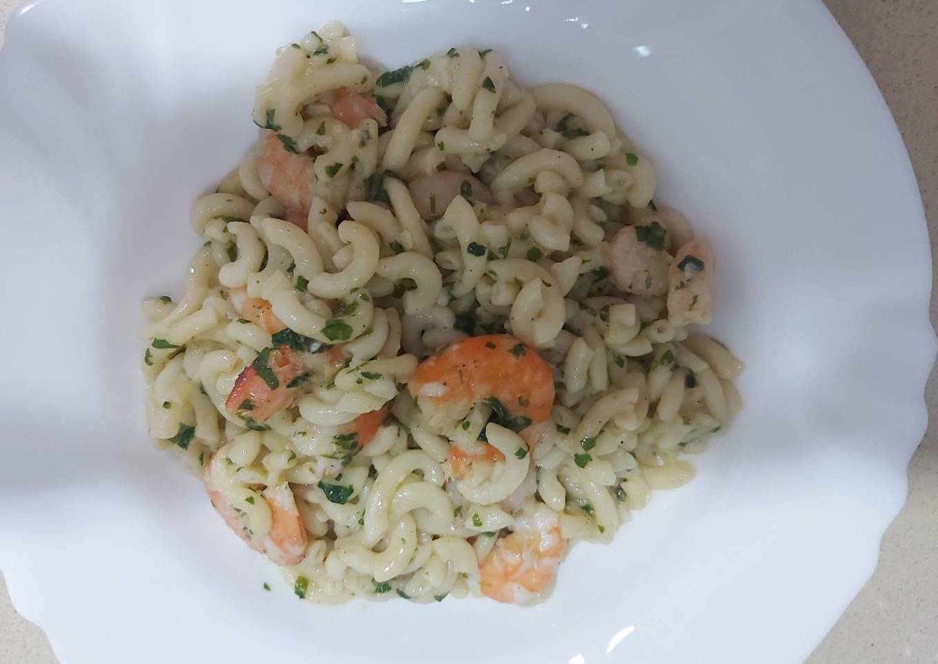 - En una olla picamos muy pequeños el ajito con aceite como dos dedos y refreímos, antes de que se doren echamos las gambas ya peladas y movemos con un poco de sal. Cuando ya empieza a ponerse un poco blanquitas le echamos los langostinos ya pelados, el perejil y los fideuas, pimienta y movemos.