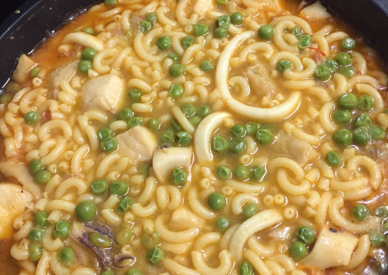 Fideuá con pescado y guisantes