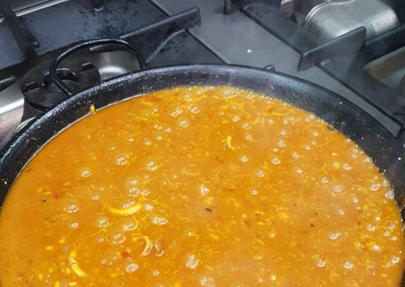 - Ahora echamos 1/2 litro de agua o caldo de pollo y el colorante, removemos un poco y cuando el agua (o caldo) empiece a hervir bajamos a media potencia y vamos dejando que se consuma el agua.