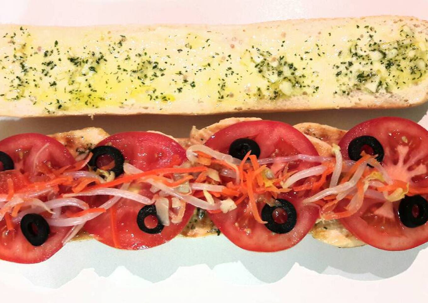 - Y por último cortaremos el tomate (lavado previamente) en rodajas finas le colocaremos sobre los filetes, cortaremos la olivas negras en rodajas, las pondremos sobre el tomate y también por encima un poco de ensalada china. El resto del picado de los ajos y perejil lo extenderemos en la otra parte del baguette.