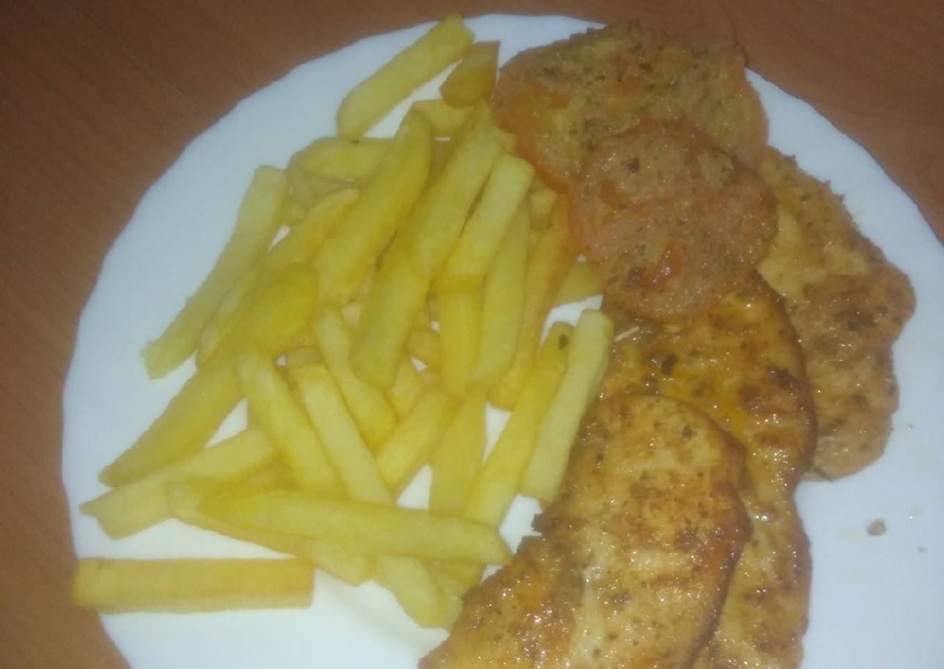 Pechuga adobada con papas fritas y tomate frito a la provenzal