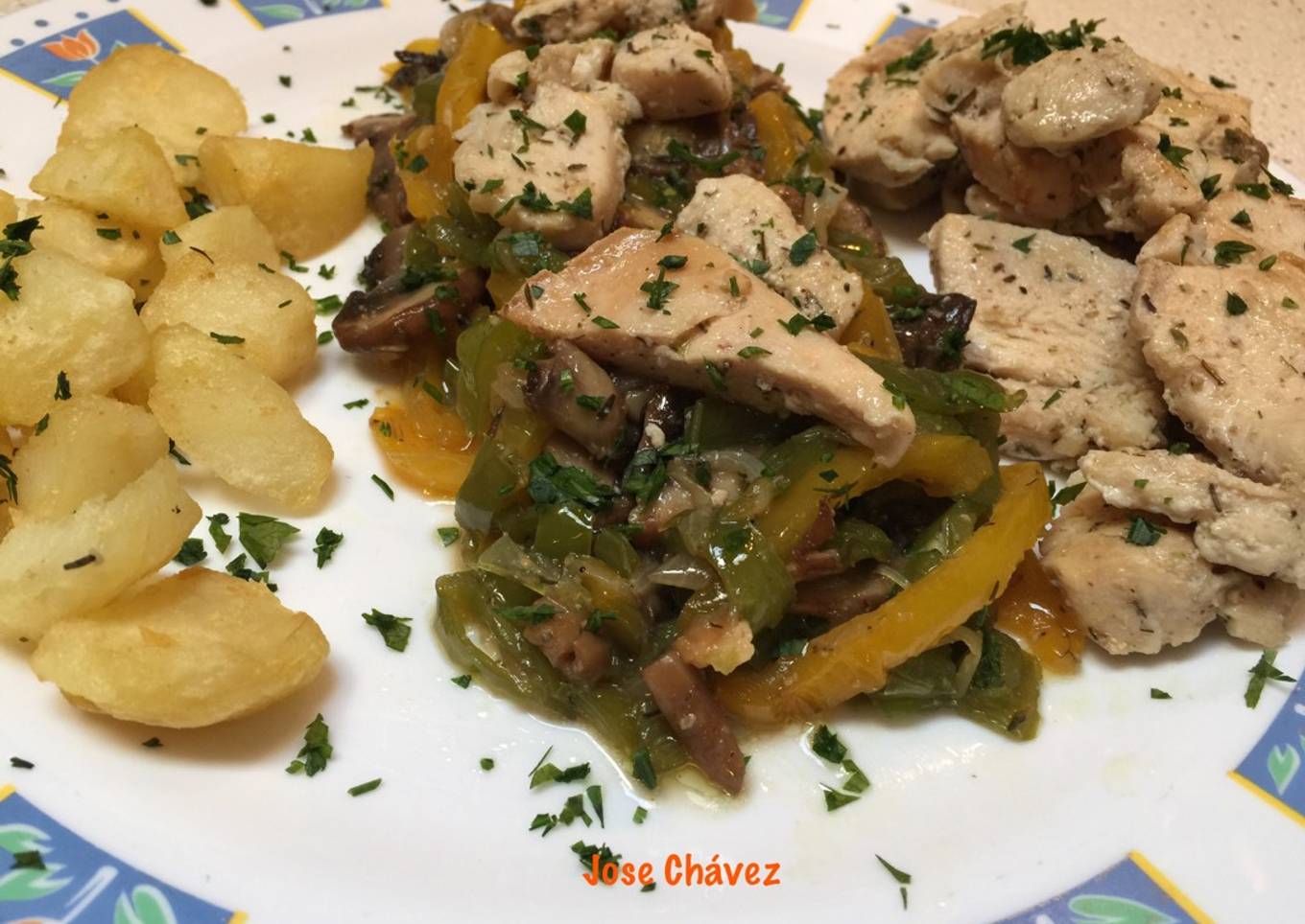 Pechuga pollo sobre cama de pimientos, cebolla y champiñones