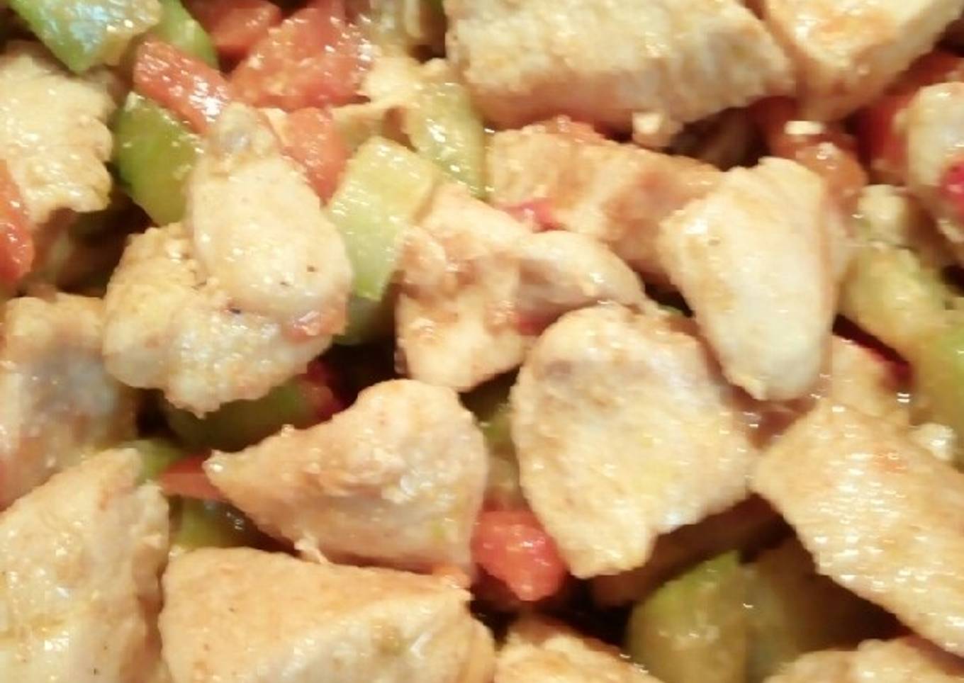 - Preparamos los ingredientes: limpiamos y cortamos a trozos de bocado las pechugas. Lavamos y cortamos a cuadritos los pimientos y la zanahoria, el calabacín un poquito más grande.