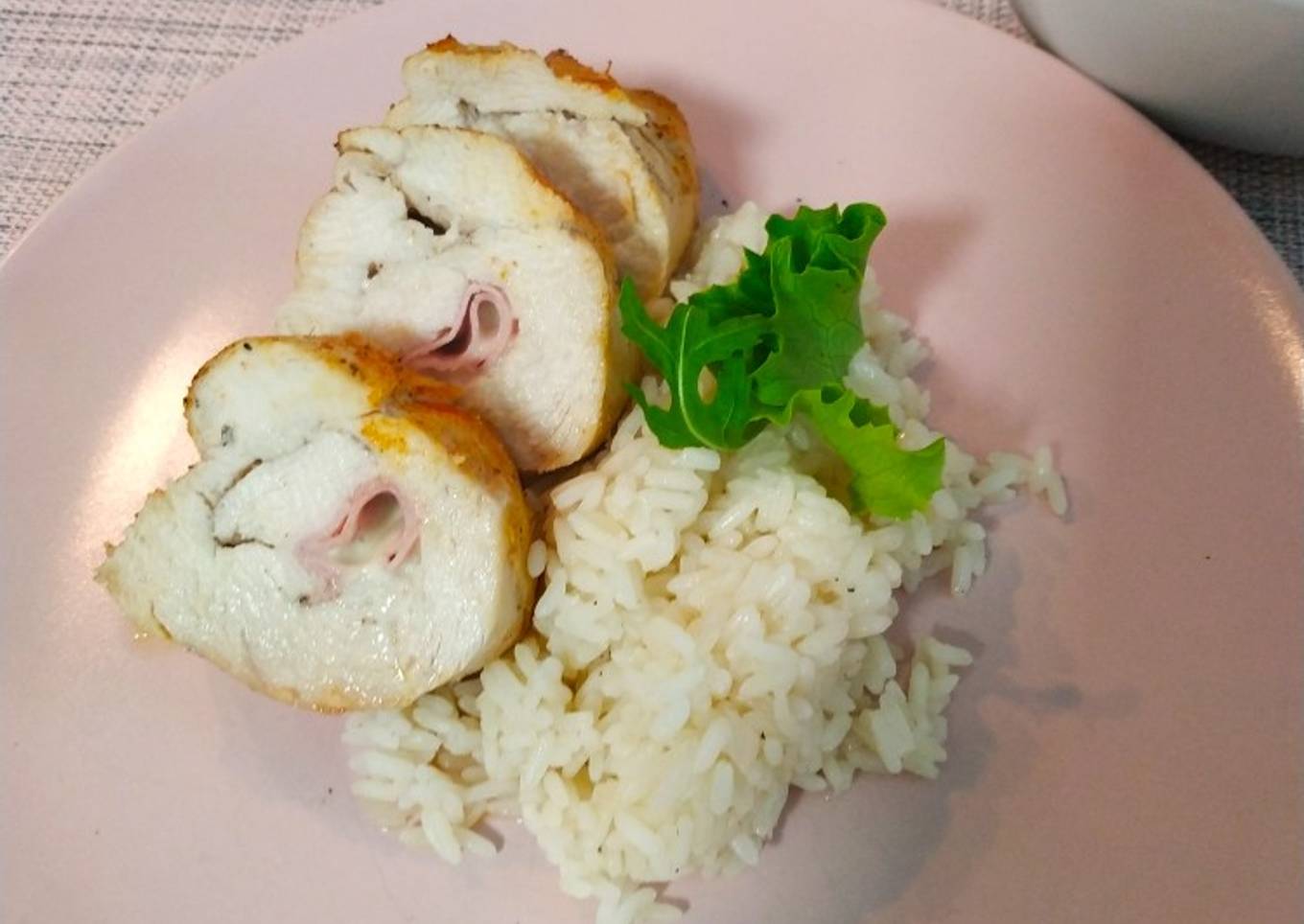 - Una vez que el arroz quedó seco y bien cocido, sin pasarse, tapar la cacerola unos 5 minutos y servirlo acompañando las pechuga de pollo relleno cortadas en rodajas.