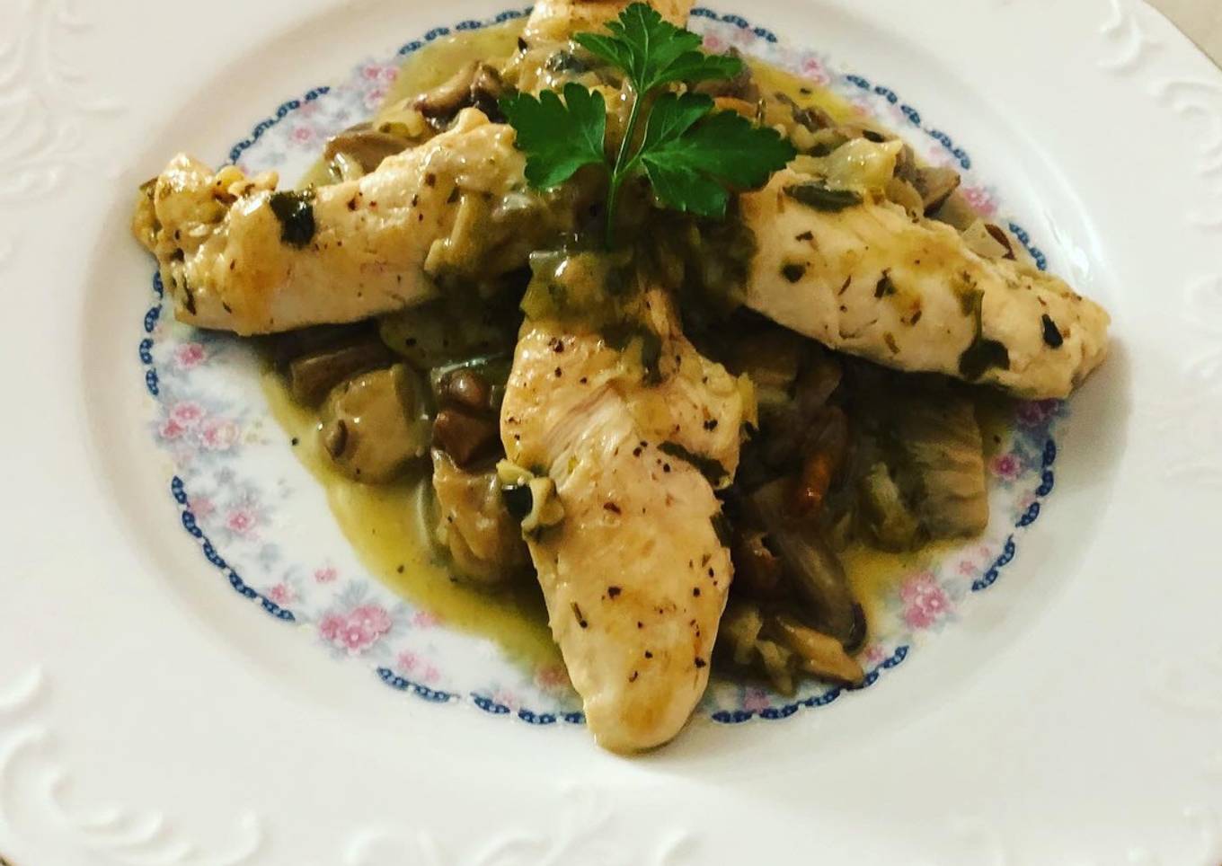 Setas salteadas con ajetes tiernos y solomillo de pechuga de pollo