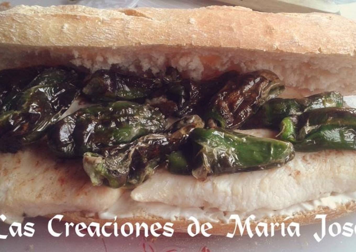 - Abrimos el pan (tamaño bocadillo, no la barra entera. Queremos comer no ponernos barrigudos). Lo untamos con mahonesa colocamos la pechugas y los pimientos, sin rabito. Ya estaría listo para zampar.