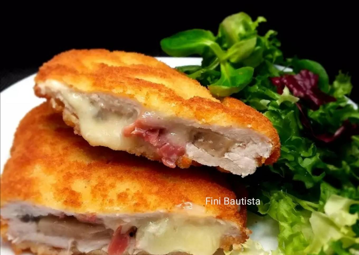 Escalopes de pechuga de pollo rellena de queso jamón y champiñón