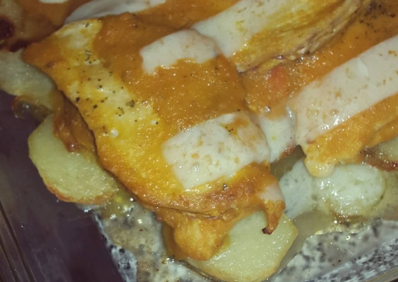 Cubrimos la base de la fuente con las patatas y ponemos los filetes y la salsa por encima.