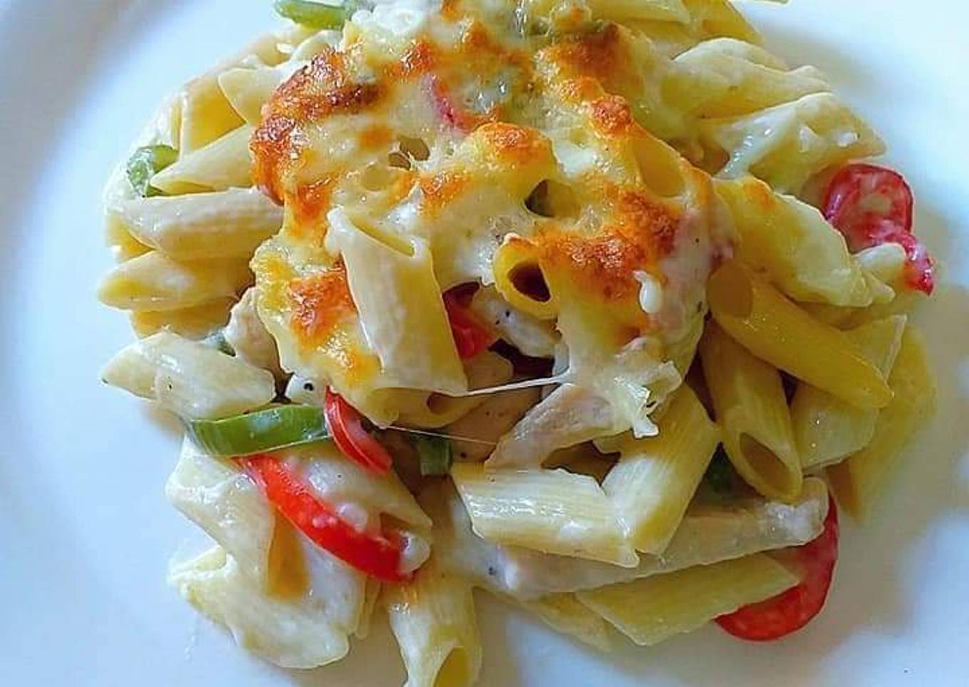 Mini penne en salsa bechamel y nata, con salteado de tiras de pechuga de pollo, pimientos y gratinados con queso mozzarella.
