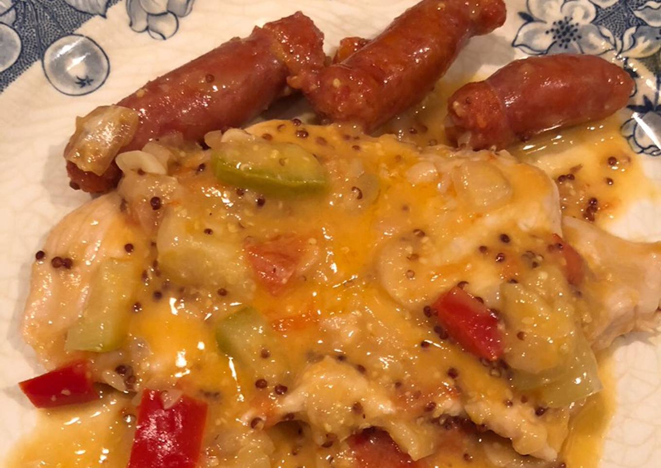 Steps to make to make Pechuga de pollo con salchichas y mostaza