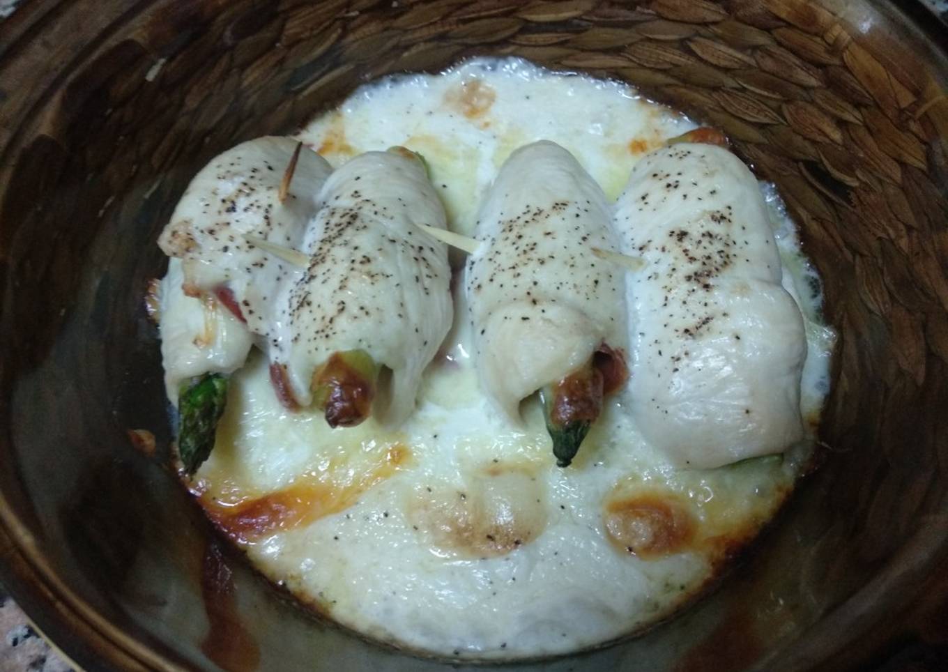 - Rellenar la pechuga poniendo en encima primero el queso, luego el jamón y por último medio espárrago por pechuga.