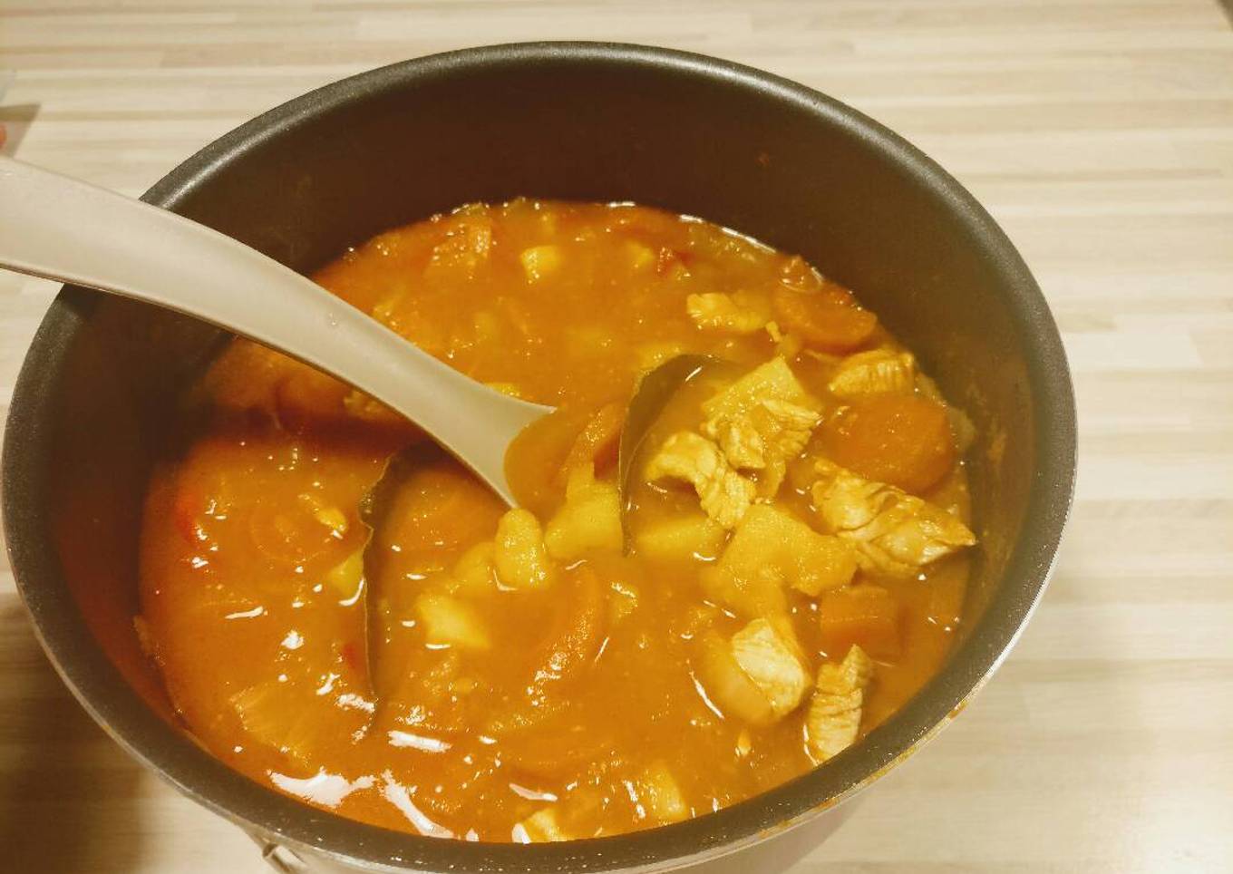 - Añadir el pollo cortado en dados grandes y las patatas. Salpimentar al gusto y añadir un vaso grande de agua (o dos si gusta más caldoso)