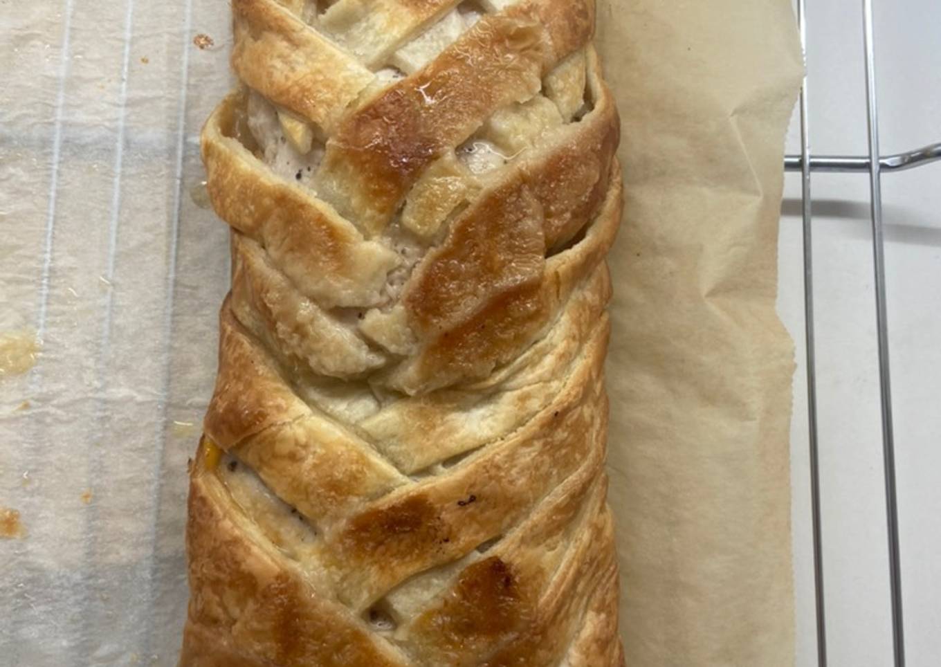 - Colocamos el hojaldre en un sitio plano y metemos los ingredientes. Primero la cebolla abajo, el queso cheddar y encima el pollo para que se termine de hacer