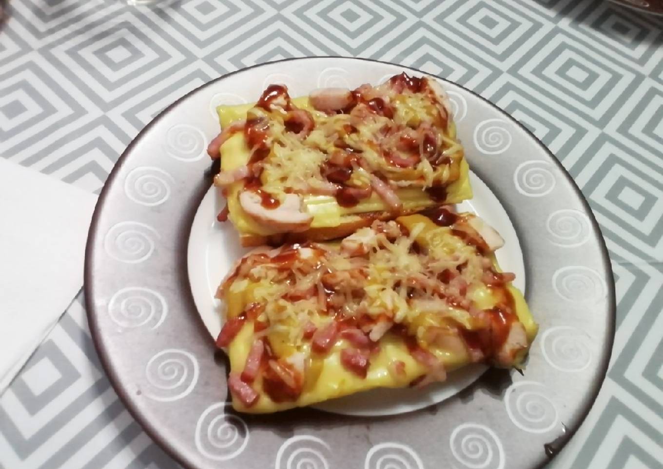 - En una bandeja de horno ponemos papel de horno y encima el pan, encima del pan untamos salsa barbaquoa, luego 2 lonchas de queso, a continuación las tiras de pechuga, después el bacon, a continuación el queso rallado y por último un poco de mostaza y un poquito de salsa barbaquoa. Repetiremos este proceso en cada panini que queramos hacer.