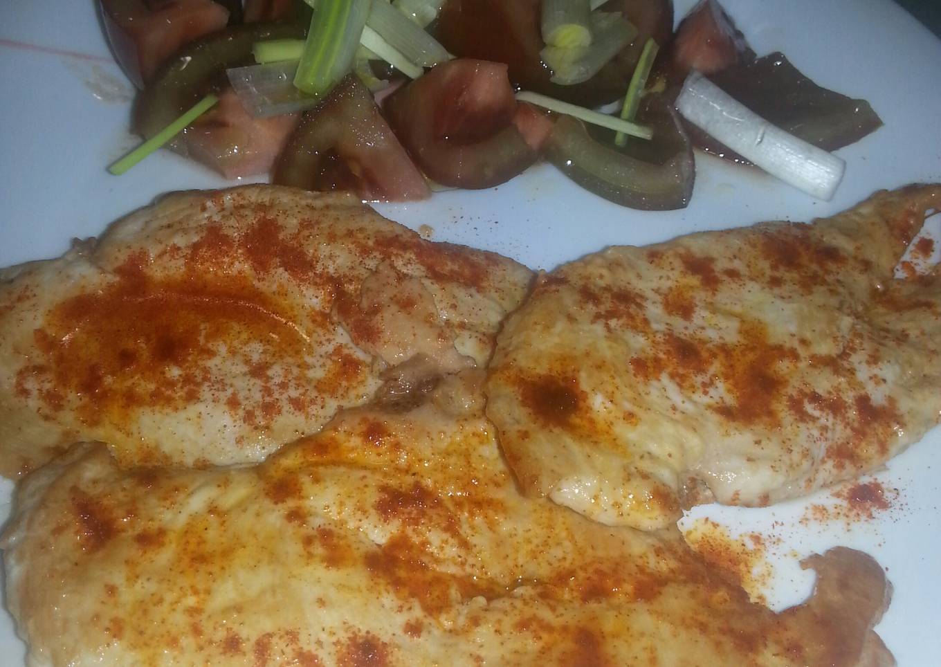 - Echar las pechugas y cuando esten echas poner en el plato , rociar por encima de las pechugas aceite de oliva en crudo y espolvorear con pimenton dulce o picante