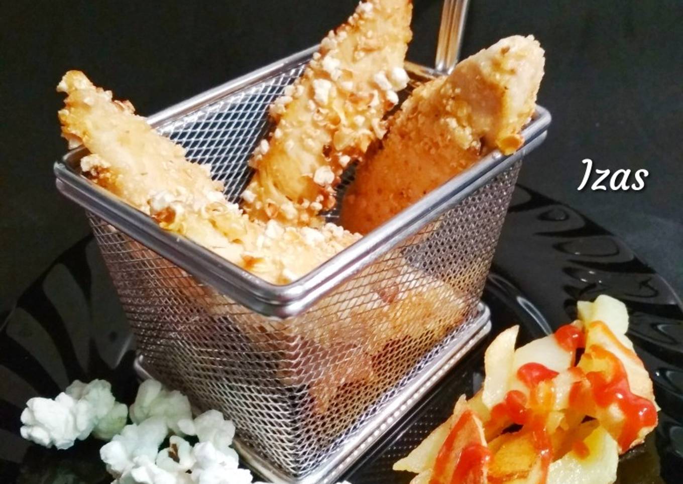 - Salar las tiras de pechugas, enharinar ligeramente pasar por huevo batido y finalmente por las palomitas que habremos desmenuzado previamente.