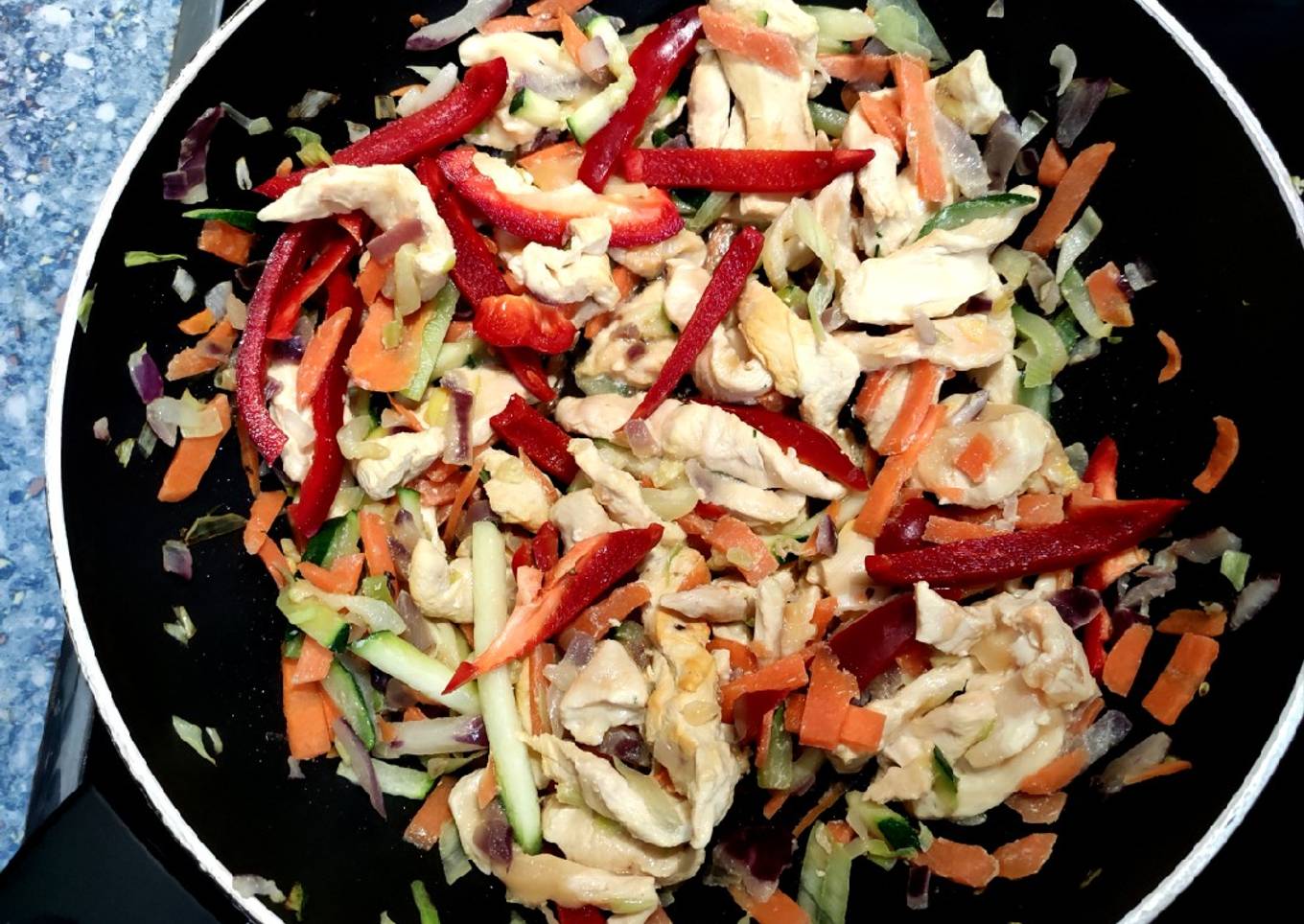 Steps to make to make Relleno de pollo para fajitas, burritos, tacos, fácil, 10 min