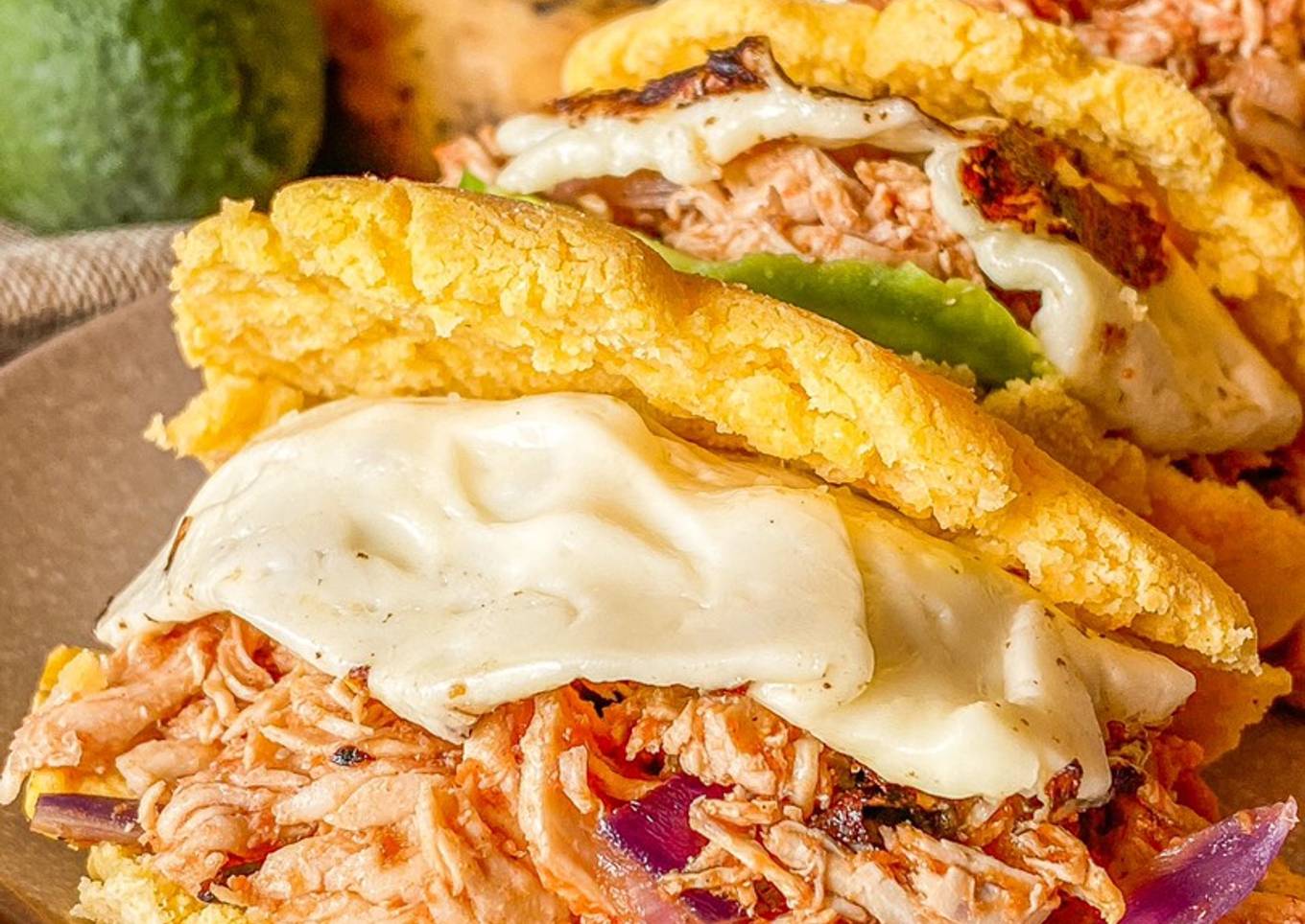 - Abrimos nuestras arepas, las rellenamos con el plátano, rodajas de aguacate, el pollo y las lonchas de queso y ¡a disfrutar!